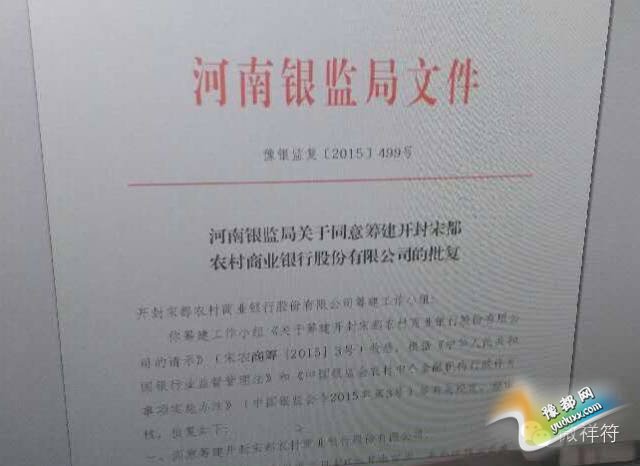 2015年12月31日,《河南省银监局关于筹建开封宋都农商银行股份有限公司的批复》(豫银监复〔2015〕499号)正式下发到祥符区。这意味着,历经一年多的开封县农村信用社改制筹建开封宋都农村商业银行工作终于修成正果!