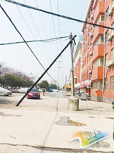 4月9日,网友刘大甜姑娘发微博向本报反映,汉兴路金明中学大门东侧一处倾斜的线杆和一根斜拉的钢丝绳挡路,给过路的行人和车辆带来很大不便,希望相关部门能将其挪走。