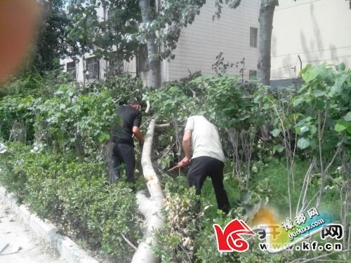 据报料的市民反映,5月31日上午,他发现有几个男子爬上大树砍伐树干,就用手机拍了下来并拨打了110,警察随后赶到事发现场制止了砍树的行为。他还说,有人将被砍大树和旁边的变电室被铁栏杆围成一个小院准备做经营,小院位置原本的景观带被清除了。他希望有关部门能够制止和处理这种在景观带上圈建小院搞经营和破坏树木的行为,给市民营造一个优美的环境。