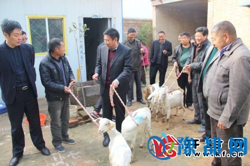 10月25日,县委常委、县委办公室主任何万峰等深入葛岗镇西空桑村贫困户楚公庆家中开展精准扶贫工作,为楚公庆送去了6只能繁波尔母山羊,助其发展畜牧养殖业,实现产业脱贫。图为何万峰将6只波尔母山羊交到楚公庆手中,叮嘱他树立信心、积极作为,尽快脱贫致富。赵春辉 摄