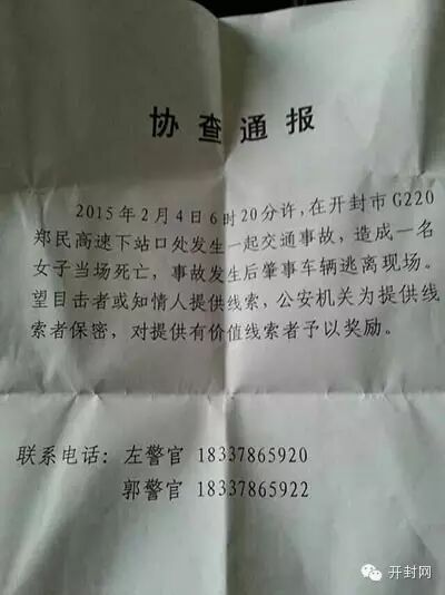 2015年2月4日早晨6点20分许,在开封市G220郑民高速下站口处发生一起交通事故,造成一名女子当场死亡,事故发生后肇事车辆逃离现场,望目击人和知情者提供线索,公安机关为提供线索者保密,对提供有价值线索者予以奖励。联系电话:0371-23111227