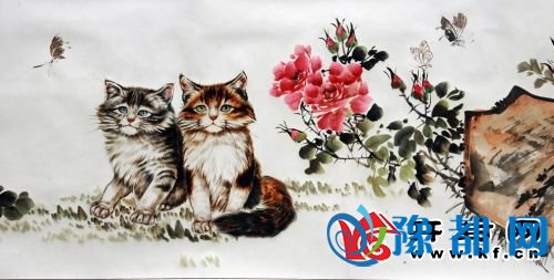 笔者看到吕玉河历时3年精心原创的大型宋韵彩烙作品《百虎图》,高90厘米、长46米。这幅画中百虎雄踞、虎虎生风、浓抹淡写、姿态各异:有的腾空狂奔,有的怒目长啸,有的隔涧相望,有的双双漫步。有两只小虎,似在蹒跚学步,严父慈母一旁蹲守凝视。三只虎崽,在母亲怀中嬉戏,一只刚露头的可爱小崽萌态十足。虎群之间,远有云山瀑布飞泉,近衬青松绿草红叶,动静相合、疏密有致。更令人称奇的是,用手可触摸到山石、树干的纹理和老虎皮毛的质感,这正是充分发挥了烙画立体感强的特质。这幅鸿篇巨制,难度还在于需要高温烙笔的无数次勾勒晕染,稍有不慎,薄薄的宣纸上将被烧出黑块或窟窿,一切将会因此前功尽弃。吕玉河创作的《百猫图》,色彩鲜明丰富,百猫栩栩如生,点缀其间的梅、兰、竹、菊、牡丹、芭蕉等静态的花木山石与动态的蝴蝶、蜻蜓及螳螂相呼应,画面丰满而和谐有序、灵动且情趣盎然。