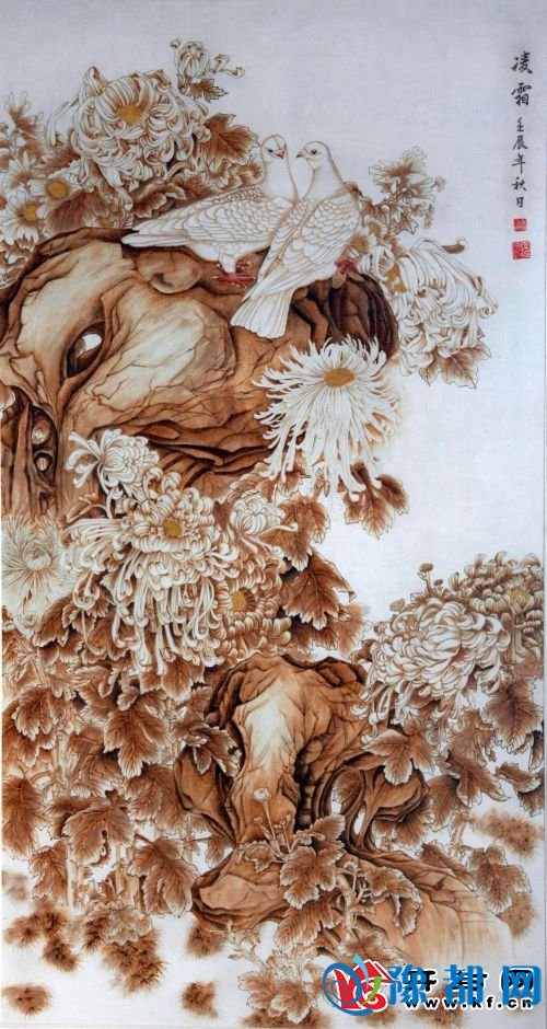 吕玉河的烙画本色作品《凌霜》,获得开封市第30届工艺美术精品创意奖,并被游客抢购。洁白的丝绢上,一簇簇或昂首、或俯瞰、或摇曳的菊花正在绽放,菊花环拥的灵璧石突兀处,两只白鸽似在呢喃。整幅作品是本色烙画特有的深酱色、褐色、浅茶色及留白,偶有黄蕊点缀,却层次丰厚、浓淡相宜,天然清雅中喷发出原始生命的顽强与勃勃生机。精细处,菊叶上的深色叶脉和白色霜粒清晰可见。