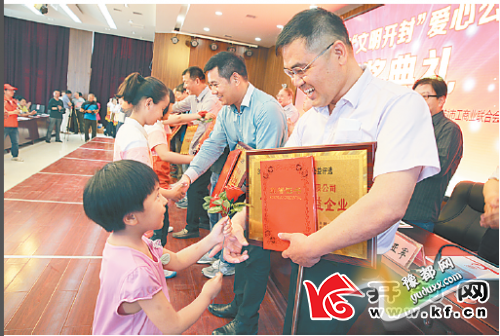 市残疾儿童康复中心的孤残儿童向获奖嘉宾赠送丝网玫瑰花。 赵文建 摄