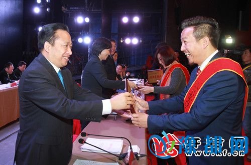 2月15日上午,全市工业强市对外开放总结表彰大会召开。图为市委书记吉炳伟、市长侯红等为受到表彰的工业强市、对外开放和招商引资工作先进单位和个人颁奖。 记者 李文璞 摄