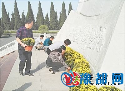 9月26日,记者来到市烈士陵园,放眼望去,道路两旁的红旗迎风招展,高大的雪松挺拔屹立,烈士纪念碑与烈士墓前的雕塑群像干净整洁,经过环境整治的园区庄严肃穆、洁净优美,短日照大菊、孔雀草、凤尾鸡冠花、国庆菊、四季秋海棠、悬崖菊、孔雀开屏艺菊等20000多盆各色鲜花将园区装扮得分外优美宜人。9月15日虽然是传统的中秋佳节,但陵园的所有工作人员都未休息。他们在市烈士陵园管理处党支部书记、主任梁和平的带领下,抓紧时间摆放花草、清洁园区、布置陈列馆……园区里一派忙碌景象。