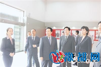 市民政局局长张晖向市领导吉炳伟、侯红介绍革命烈士事迹陈列馆情况。