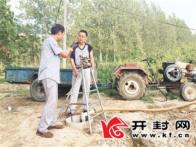 盛夏时节,尉氏县洧川镇西三赵村的田野里一片碧绿。随着抽水机的轰鸣声,清冽的井水通过水管流进了一望无际的花生地,花生苗贪婪地吸吮着“甘霖雨露”……